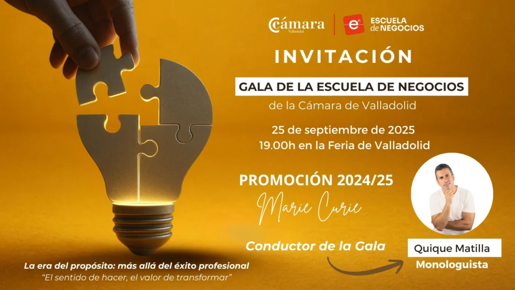 La Cámara de Valladolid se complace en invitarte a asistir a la Gala Anual de la Escuela de Negocios, que tendrá lugar el próximo 25 de septiembre, a las 19:00 horas (a las 18.40h la recepción de asistentes), en el auditorio II de la Feria de Valladolid. Se procederá a la clausura de la Promoción 2024/25 y daremos la bienvenida a los nuevos alumnos de la Promoción 2025/2026.